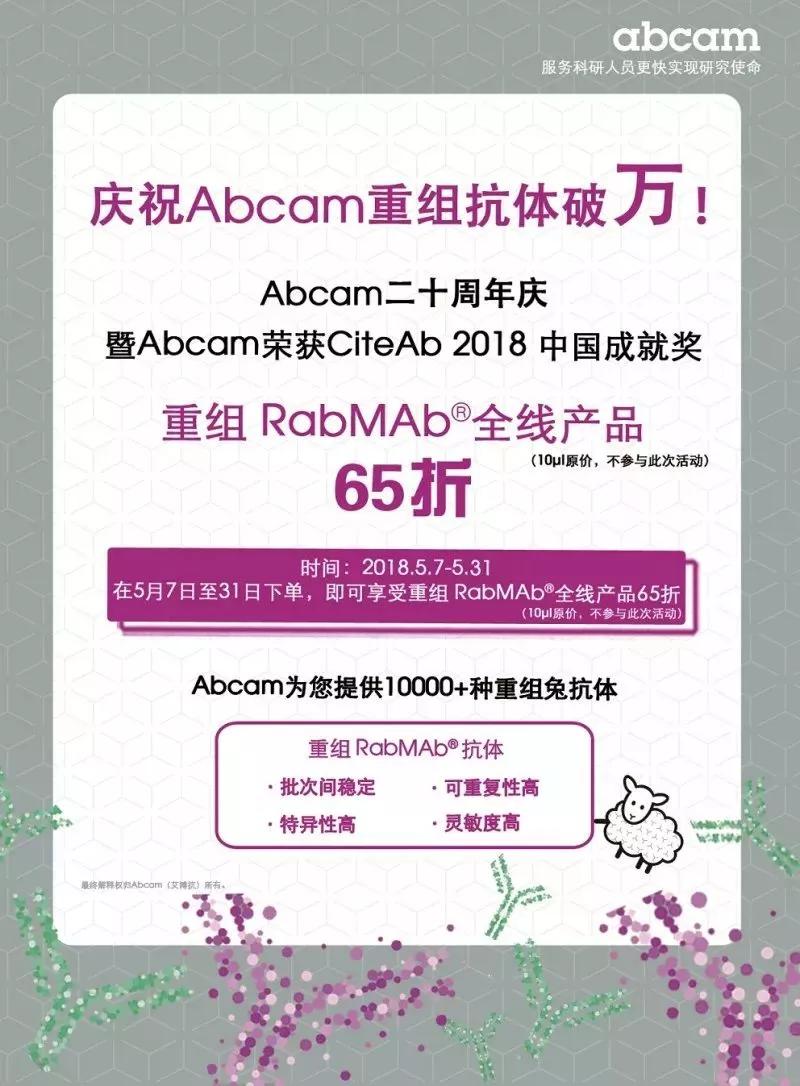 Abcam二十周年庆第二波活动重磅来袭,为回馈长期支持Abcam的新老用户,重组RabMAb?(abcam专利兔单抗)全线产品,低至65折(小包装10...2018-05-23 09:53:00.0