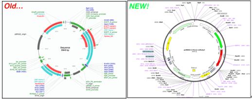 以下三个因素使我们的SnapGene质粒图谱更便于浏览。这些实用而有效的更改将使您能够快速找到具有所需功能的质粒。