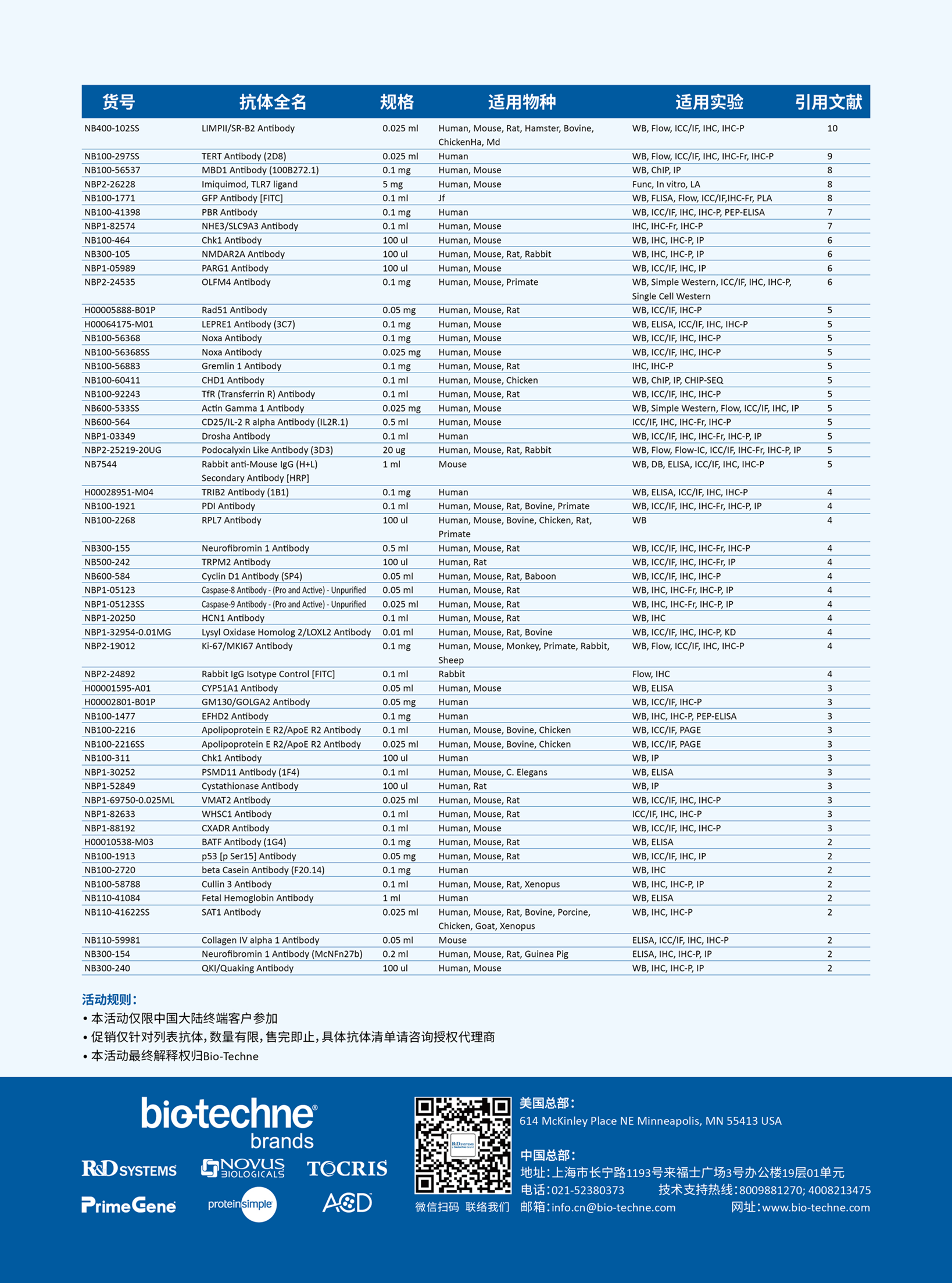 2)参与活动的抗体有约400种,全部为现货,每种抗体只有1支,3.9折秒杀,完整列表见下文。