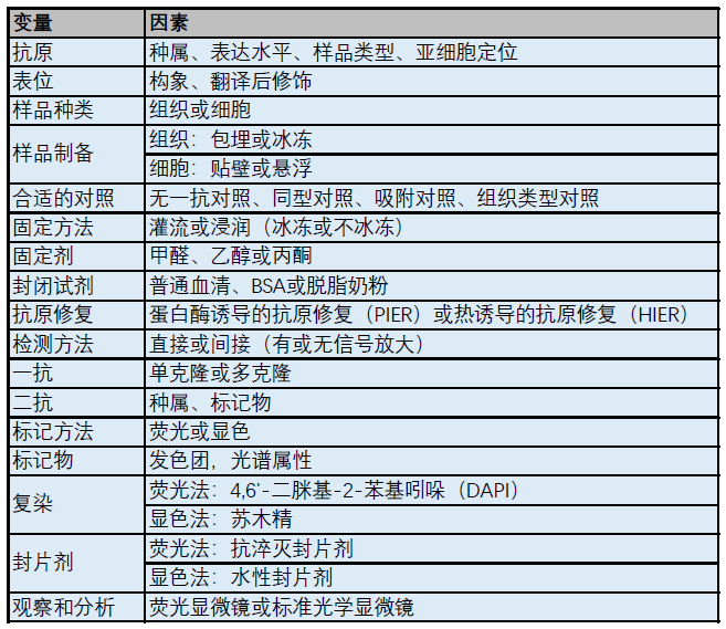 下表列出了影响IHC/ICC的变量和因素,旨在有助于IHC/ICC实验的设计、优化及疑难的解答。
