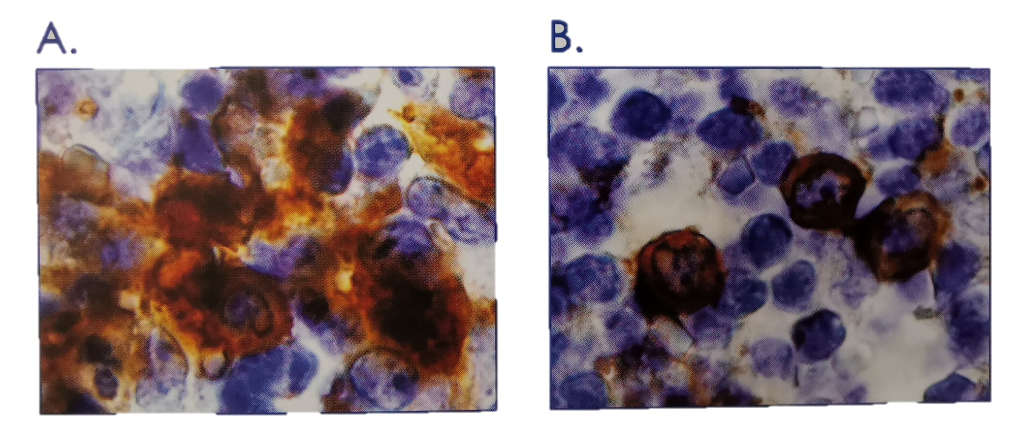 血清可以有效封闭非特异性结合。A. 用生物素标记的抗人CD14亲和纯化多克隆抗体(货号BAF383)检测石蜡包埋的人扁桃体组织中的CD14。使用碱性抗原修复试剂盒(货号CTS013)修复组织抗原。用HRP标记的高灵敏度链霉亲和素(HSS-HRP)和DAB染色并用苏木精复染(蓝色)。B. 在平行实验中,与一抗孵育之前用动物血清室温下封闭15分钟显著降低了非特异性背景染色。R&D Systems的所有细胞和组织染色试剂盒中都含有HSS-HRP和动物封闭血清。
