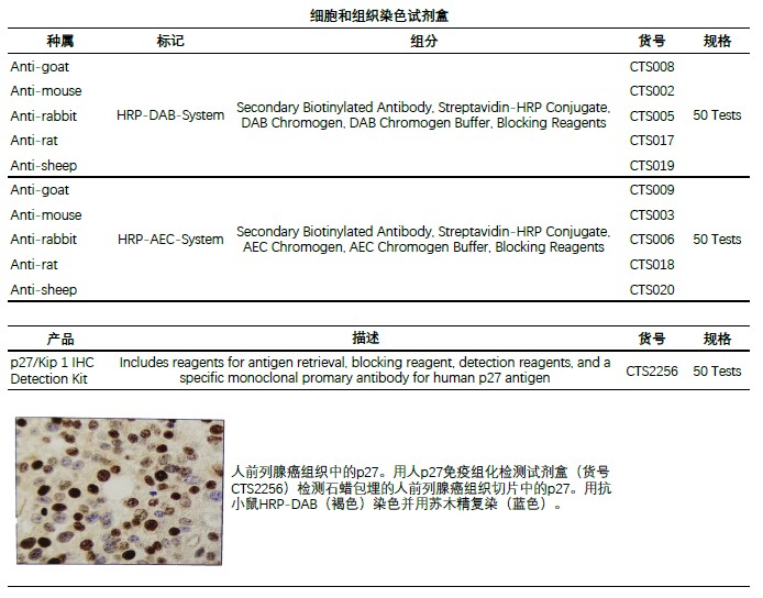 细胞和组织染色试剂盒用于各种组织学和细胞学样品中抗原的定位。这些试剂盒是基于亲和素与结合了组织里目标抗原的一抗之间形成的和素-生物素复合物(ABC)的原理,设计成即用型的规格。包含了稀释好的生物素标记的二抗和 HSS-HRP,无须额外的孵育步骤,减少了手工操作的时间,降低了人为估算错误的风险,非常方便。