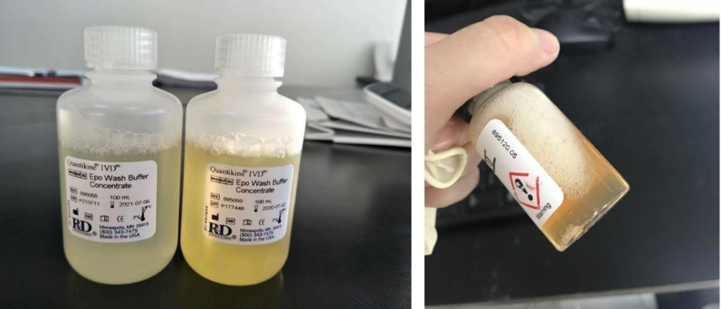 这些成分在低温或是稀释液微量蒸发的情况下,会出现结晶或浑浊的现象,如下图所示的那样,会在说明书中详细标注。(图例:Human sTNF RII/TNFRSF1B Quantikine ELISA Kit,货号 DRT200)。