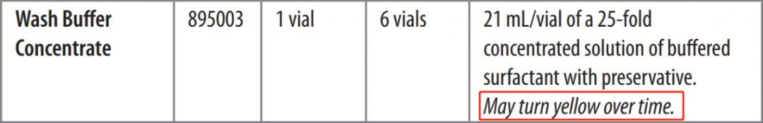 这种成分本身在长时间存放后,会由无色变为浅黄色。而这种改变既不会影响 Proclin300 本身的抑菌效果,也不会对 ELISA 实验造成干扰。在 R&D Systems® 的说明书(图例:Human IL-6 Quantikine ELISA Kit,货号 D6050)中,也对洗液变黄做了说明。
