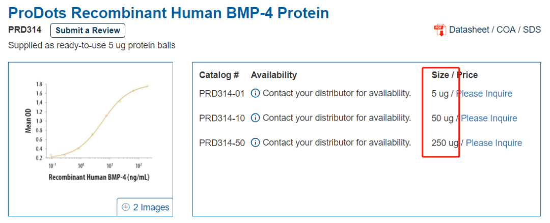 ProDots® 蛋白小球可在培养基中立即溶解,开封前 4 ℃ 保存条件下保证 6 个月的稳定性。多种规格可选,以 ProDots Recombinant Human BMP-4 Protein(货号 PRD314)为例,有 5 μg、50 μg 和 250 μg 三个不同的规格,5 μg/颗的独立包装,250 μg 包装有 50 个独立小瓶。从而弥补常规包装的不足,满足不同研究所需。